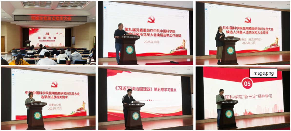 为及时传达院党组工作部署和相关文件精神、顺利推进中国科学院昆明植物研究所党委纪委换届选举工作,10月16日下午,资源室党(总)支部在行政楼三楼报告厅召开全体党员大会。会议由资源室党总支书记李巧宏主持。 首先,会议聚焦两委换届选举工作专项部署,明确关键环节与要求,为后续选举工作筑牢基础。党委委员张石宝详细说明了中共中国科学院昆明植物研究所党员大会换届选举工作要点,并清晰阐述换届工作的核心目标与关键标准;党总支书记李巧宏介绍候选人预备人选情况及大会整体安排,保障选举工作的公开性与透明度;党委办公室主持工作副主任冯石向全体党员介绍了新一届党委、纪委委员候选人预备人选产生过程、大会安排和选举办法,以确保选举工作合法合规推进。 随后,会议围绕重要精神开展专题学习,推动理论学习与工作实践深度融合。资源室第二党支部书记桂恒带领全体党员学习《习近平谈治国理政》第五卷要点,通过重点解读核心内容,教育引导党员同志原原本本学、联系实际学,将学习成效转化为加快抢占科技制高点的强大动力;资源室第一党支部书记申国境向全体党员同志传达院党组2025夏季扩大会议精神和“新三定”文件精神,带领党员了解我院“十五五”战略目标、重大任务部署、重要工作领域及重点改革举措深入解读改革方向,强调要将会议部署与支部日常工作、党员个人职责紧密结合,切实把学习成果转化为推动工作的实际动力。 会议要求,全体党员要高度重视,持续深化对换届选举要求的理解,严格遵守选举纪律,将理论学习成果融入日常工作,以更高标准、更实作风推动各项任务落地。