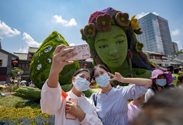 Visitors take selfies in front of a plant sculpture at the Jinbi Square in Kunming, southwest China's Yunnan Province, Oct. 2, 2021. The first part of the 15th meeting of the Conference of the Parties to the UN Convention on Biological Diversity (COP15) is set to kick off in Kunming on Oct. 11. (Xinhua/Chen Xinbo)