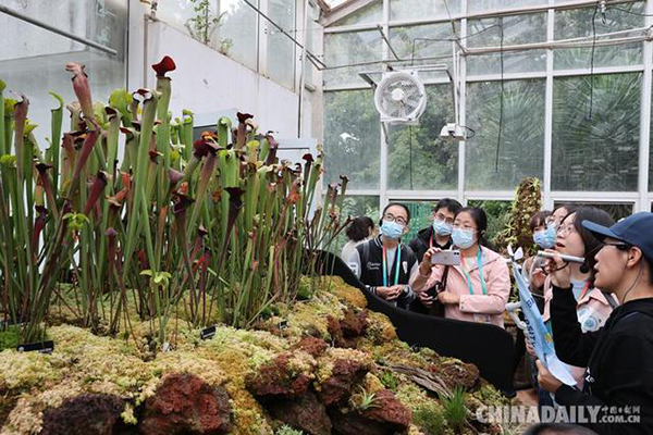 10月14日,COP15参会记者在“扶荔宫”种子博物馆参观采访。(中国日报记者 冯永斌 摄)