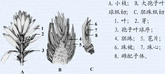 图3. 重建的古蕨属植物 A. 重建的植株的外貌;B. 枝条;C. 生殖枝孢子囊内有大、小孢子之分(百度文库:植物的起源和演化) 前裸子植物在石炭纪演化中有两个主要类群(Hilton, 2007): 1、种子蕨(Pteridosperms),有蕨类的营养体和真正的种子。石炭纪的凤尾松蕨(Lyginopteris oldhamii)就是以种子进行繁殖的,它是目前被研究得最清楚的种子蕨,其种子小型,外有1杯状包被,其上生有腺体,据推测种子蕨可能是苏铁类和被子植物的祖先(Crookall, 1930)。