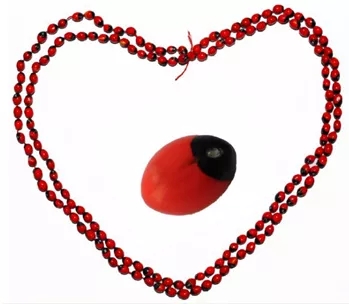 相思子种子及其制成的项链 相思子(Abrus precatorius)美丽的种子,使人一见便会情不自禁地想起王维“红豆生南国,春来发几枝。愿君多采撷,此物最相思。”这首被人们千古传诵的古诗。 相思子的种子为椭圆形或圆形,长5-7毫米,顶部有脐的三分之一为黑色,下部三分之二为红色,整个种子色泽鲜亮,质地坚硬,富有特色,因此常被制成各种饰品。 但你知道吗,这么美丽的种子却含有剧毒,其种子中的相思子毒蛋白和相思子碱能强烈抑制细胞蛋白质的合成,因此人只要误食其一粒破损的种子,就会有性命之忧。 当然,种子中的这些毒素,并不是专门针对人类的,而是为了防止病菌的侵害和动物的过度采食,从而保证该物种能够顺利繁衍,是植物在长期进化过程中形成的一种自我保护和防御机制。