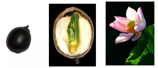 莲的果实、莲果实纵剖图、莲花(从左到右) 莲(Nelumbo nucifera)花“出淤泥而不染,濯清涟而不妖”,以圣洁高雅的气质获得了人们的喜爱,为千百年来诗人墨客争相歌咏绘画的主要题材之一。 花谢果现,莲的成熟果实长1.5-2.5厘米,呈椭圆形或卵形,镶嵌于喷淋头状的花托内,仅顶端露出。只有待花托变干,隔室口变大后,才会掉落水中,或者只有当花托落入水中腐烂后,才会释放出来。为了适应其水生环境,莲的果皮特化为角质,极为坚韧,且厚达0.5-0.6毫米,具有较强的抗压性,能对内部的种子起到极好的保护作用。另外,在果皮的表皮细胞下面,存在着一层坚固而致密的栅栏组织,能有效防止水分进入;幼果果皮气孔下面原本进行气体交换的气孔道,在果实完全成熟后,也会缩小并封闭,从而使果实变成一个密封舱。 莲的种子也因此具有了较深的物理休眠,即尽管其胚已分化完全,具有了2枚一长一短、弯折的绿色子叶和黄绿色、条状的胚芽,以及黄色、圆柱形的胚根,但在适宜的发芽条件下仍不能萌发,只有待果皮和种皮破损,水分大量进入后,才会顺利萌发。靠着果皮与种皮之间,胚与胚乳间空隙中保留的大约0.2cc的空气,以及黄白色胚乳的营养供应,莲种子的寿命就居然可达1288(±250)年,成为我国自然条件下寿命最长的种子,真是让人惊奇不已!