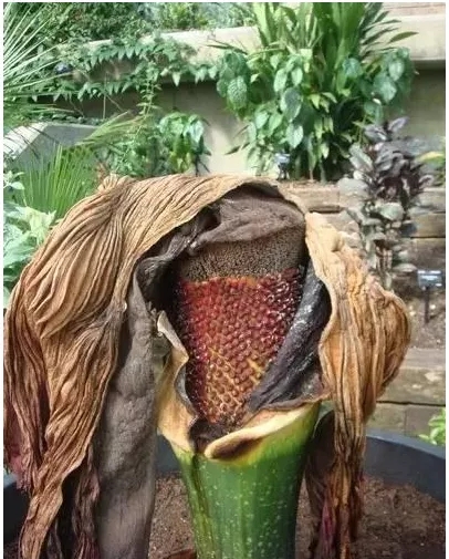 巨魔芋巨大的叶片和球茎(图片来自网络) 巨魔芋在营养周期的生长过程中,每年都只长出1片叶子,在生长周期的后阶段,叶柄可高达3-4m,叶片直径超过5m。巨魔芋通常需要经过至少7年的积蓄,球茎长到50cm左右且储存足够的养分后才能开花。 进入生殖周期后,首先形成的是“肉穗花序”。在肉质的花序轴上,密集地生长着许多小花,雄花在上,雌花在下,它们一起构成“肉穗”,并且被一大片“佛焰苞”裹起来。肉穗花序会自己发热,温度可达36℃以上,大量散发出模仿腐肉的臭气,这些气味物资主要为二甲基二硫化物和二甲基三硫醚,吸引食腐的昆虫麻蝇和埋葬甲来传粉。