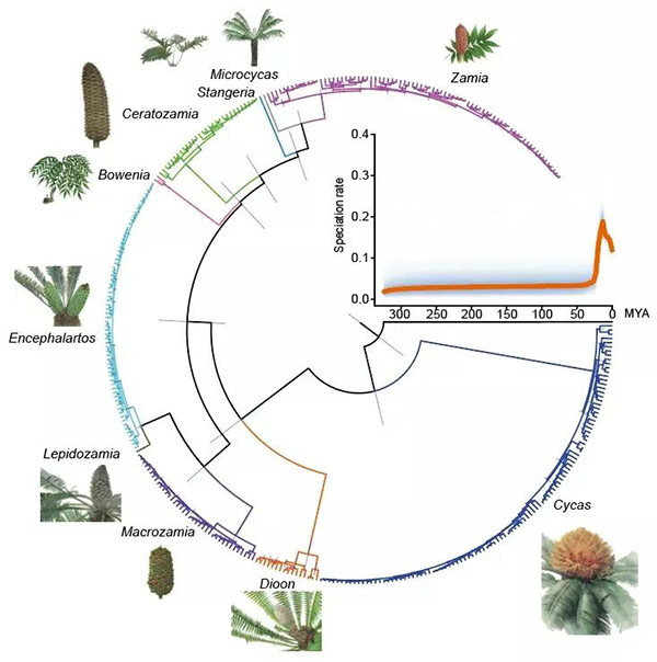 研究团队基于现存苏铁目339种植物的转录组数据,重建了苏铁类自身的系统发育关系,确定了苏铁演化的完整历史。分子钟分析表明,现存苏铁的多样化同步发生于距今1100至2000万年之间,是中新世以来气候剧烈变化的结果。