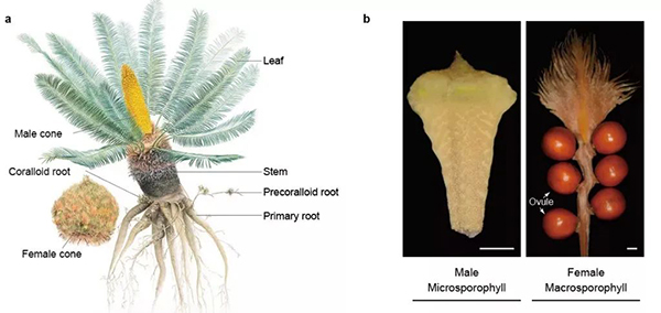 a:攀枝花苏铁;b:攀枝花苏铁雄株和雌株的孢子体 研究还发现,苏铁种子的毒性虽限制了苏铁的食用功能,但其仍能发挥出重要的社会效益。研究团队在攀枝花苏铁基因组中发现一种细胞毒素蛋白基因(fitD),该基因起源于细菌,通过水平基因转移的方式转移到真菌和苏铁中。 深圳仙湖植物园张寿洲教授介绍,“本次发现的毒性蛋白能够杀死一些常见昆虫,如棉铃虫、小菜蛾等,目前已通过基因重组技术将其成功应用于棉花,事实证明其杀虫效率比现有抗虫棉更高,可在棉花种植中进行推广。此外,该毒性蛋白的植物性来源,也使其对玉米等农作物具有更安全、更高的保护性。” (科技日报 2022年4月19日) 来源:https://mp.weixin.qq.com/s/qw_8fvAVvLzzcIfBpXicng |
