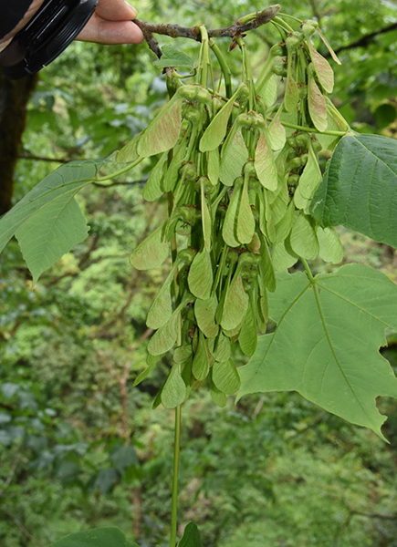 此次发现的2个漾濞槭种群均在国家级自然保护区内,并经华南植物园陈又生研究员确认。其中,文山老君山国家级自然保护区内发现的漾濞槭种群最大,约80余株,胸径最大者达133厘米,伴生有野核桃、水青冈、水青树、房县槭、云南金钱槭、竹类等物种;景东无量山国家级自然保护区内发现的漾濞槭种群有30株,胸径最大者达48厘米,伴生有白檀、房县槭、扇叶槭、核桃等物种。
