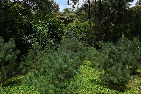 昆明植物园毛枝五针松迁地保护种群 昆明植物园从1988年就开展了毛枝五针松的迁地保护研究,对其种子贮藏、育苗、生长发育规律、适应性等进行了系统的研究。1989年,进行第一次引种,栽培于昆明植物园濒危植物园。其中,从麻栗坡县火烧梁子迁地保护的毛枝五针松于2009年结果,但种子未发育;2013年得到了发育良好的种子。为了继续深入开展毛枝五针松的迁地保护研究,2014年秋,第二次从云南省红河州屏边县引种了一批1年生种子萌发幼苗。2015年,25株幼苗迁地保护于昆明植物园极小种群野生植物专类园,对其进行生长动态检测、数据采集分析以及迁地保护实验研究等。经过园区管理人员多年的科学管护,所有幼苗均已成活,20厘米高的小苗长成了平均1.8米高的健康植株,其中一株个体于2021年首次结实,但当时未观察记录到有球花,仅见挂着两粒球果。而今年,共有12株毛枝五针松进入盛花期,球花挂满枝头,另有一株已挂果3粒,标志着昆明植物园对毛枝五针松的迁地保护基本成功。这也侧面说明毛枝五针松的适应性强,种质资源发掘利用前景广阔,也对其引种、保护和回归等实践具有重要的意义。