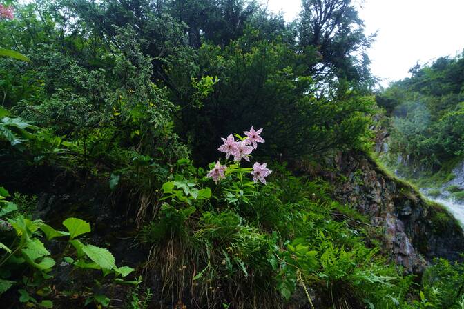 云南八大名花之百合花-多斑豹子花 云南野生花卉资源的特点首先是不同的地理环境有不同的种类,比如暴生花、绿绒蒿、龙胆等花卉分布于滇西北、香格里拉等地方;其次是云南花卉具有丰富性,同一类花卉有不同的种类,比如杜鹃花在颜色上也有不同;最后在分布上也有其特点,根据不同地理环境所生长的花卉也不一样。