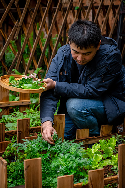 上官法智的花园一景。新华社记者 胡超 摄 打药、剪枝、施肥、杀虫、采摘、做菜,成了上官法智生活的一部分。在他的精心打理下,每个季节,都有植物吃。也正因为亲力亲为,当自己栽的植物上桌,他才会兴奋不已。 鲜花作衬,美味留香,爱植物的人也热爱生活。上官法智很感谢生物多样性带来的乐趣。