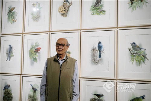 曾孝濂先生在展览现场 李熙临 摄 曾孝濂先生1958年就职于中国科学院昆明植物研究所并受聘为研究员级高级工程师,终身从事生物绘画工作。他先后出版了《云南百鸟图》《百鸟图精品选》《花之韵<鸟语·花香>》《云南花鸟》等画册,还设计了《杜鹃花》《杉树》《苏铁》《君子兰》《百合花》《绿绒蒿》等多款邮票。
