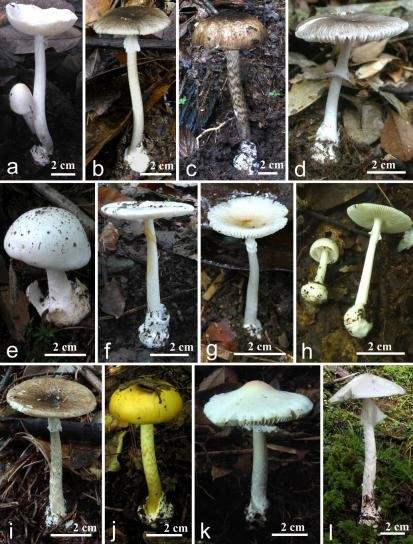 a. 致命鹅膏; b. 灰花纹鹅膏; c. 拟灰花纹鹅膏; d. 灰盖粉褶鹅膏; e. 软托鹅膏; f. 淡红鹅膏; g. 小致命鹅膏; h. 裂皮鹅膏; i. 近灰花纹鹅膏; j. 黄盖鹅膏; k. 假淡红鹅膏; l. 鳞柄白鹅膏 剧毒蘑菇黄盖鹅膏,俗名黄蘑菇,它与可食用的红黄鹅膏 (俗名黄罗伞、黄蜡伞、黄把伞、鸡蛋菌)十分相像,2002-2013年共有16人因误食而中毒死亡。与我们食用的草鸡枞相似的灰花纹鹅膏,在1994-2012年期间,引起了350余人中毒,79人死亡。2000-2014年,有89人因误食致命鹅膏中毒,45人死亡。