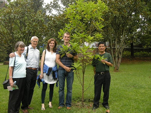 2009年9月20日,Paul Mathew一家与孙主任在焕镛木前合影 经过园区管理人员多年科学管护,一株生长至4.2米、胸径8厘米,一株有5.6米、胸径11厘米,均已开花,且花蕾繁多,标志着昆明植物园对该物种的迁地保护工作取得了初步成功,为下一步的科学研究和物种保护奠定了基础。
