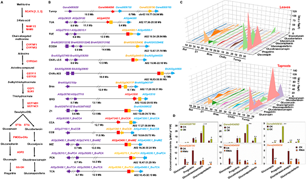 图2. 芸苔属物种/亚种间MAM假基因的鉴定及在蔓菁和白菜中MAM假基因的功能验证。 在脂肪族芥子油苷代谢通路中,AOP2也是与风味和Glucoraphanin(其降解产物萝卜硫素具有抗癌作用)相关的关键基因。前人的研究发现苷蓝中的三个AOP2基因,其中的两个是假基因促使了苷蓝中萝卜硫苷物质含量的增高。然而,蔓菁和白菜中都有3个功能型的AOP2基因。本研究利用RNAi技术抑制蔓菁和白菜中AOP2基因的表达,增加了蔓菁和白菜中萝卜硫苷物质的含量,并造成蔓菁辛辣味降低。以上结果表明,蔓菁和白菜的假基因差异影响与风味相关的脂肪族芥子油苷代谢通路相关基因的进化,最终导致了蔓菁和白菜的风味差异。此项研究为芸苔属作物育种提供了参考。