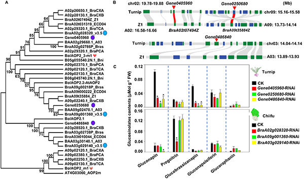 图3. 芸苔属物种/亚种间AOP2基因的进化特征及利用RNAi技术分别沉默蔓菁和白菜中的三个AOP2基因并检测脂肪族芥子油苷代谢物质的含量。