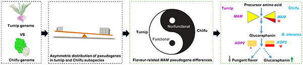 图4. 脂肪族芥子油苷代谢通路中假基因的不同进化模式对芸苔属亚种蔓菁和白菜风味差异的影响。 (云视新闻 2022年9月16日) |
