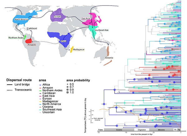 中国科学院昆明植物研究所杨祝良研究员带领的研究团队长期从事大型真菌多样性与分子进化研究。近日,在广泛采样及与国内外同行合作基础上,杨祝良研究员指导的博士研究生Jean Evans I. Codjia等人员利用来自非洲、大洋洲、欧洲、亚洲、北美洲和南美洲的样品,基于200余物种4基因片段(nrLSU, rpb2, tef1-α, β-tubulin)的核苷酸序列,构建了该属鞘托鹅膏组的系统发育,重建了祖先分布区,发现该组可能在晚古新世至早始新世(约56 Ma)起源于非洲,之后从非洲扩散至东南亚,东南亚的物种祖先后来向东北经过白令陆桥扩散到北美,后至安第斯山脉北部,向南扩散至澳大利亚和新西兰,向西北扩散至欧洲。在45–36 Ma,鞘托鹅膏组祖先从非洲通过跨洋传播到达亚马逊平原,于25–20 Ma从亚马逊平原扩散到加勒比海地区。虽然鞘托鹅膏组与其姐妹组橙盖鹅膏组(Amanita sect. Caesareae)有相似的起源进化史,但鞘托鹅膏组物种具有更强的扩散能力和对新环境更强的适应性,北温带支系物种分化速率更快,而新热带支系具有生态位保守性。