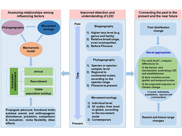 图3、未来植物长距离扩散整合研究框架 最后研究还总结了植物长距离扩散的研究方向和重点,提出了基于多学科交叉的整合研究范式:首先,整合运用生物地理学、谱系地理学和运动生态学,更加精确地还原长距离扩散事件的发生过程;其次,重点研究上述六个关键因素对植物长距离扩散后拓殖成败的影响程度及耦合关系,以确定关键制约要素;最后,通过地史时间尺度(百万年尺度)和短时间尺度(人类世以来)植物长距离扩散后拓殖机制的比较,为应对全球变化下生物入侵、生物多样性丧失等问题提出了解决方案。 该研究明确了影响植物长距离扩散后在新生境中拓殖的六个关键因素,构建了评估拓殖成功率的预测模型,提出了未来植物长距离扩散的整合定量研究新框架。该研究以“The establishment of plants following long-distance dispersal”为题,在线发表于国际生态与进化领域权威期刊Trends in Ecology & Evolution上。吴增源副研究员为论文第一作者,李德铢研究员和希伯来大学Ran Nathan教授为论文共同通讯作者。该研究得到了中国科学院B类先导专项(XDB31000000)、国家自然科学基金(42171071,31970356,41971071,32170398)、中国科学院青年创新促进会(2019385)和中国科学院“西部之光”等项目的资助。 (人民日报客户端 2022年11月29日) |