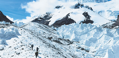 科研人员行走在海拔5900多米的冰碛垄上。 郭永杰摄(人民视觉)