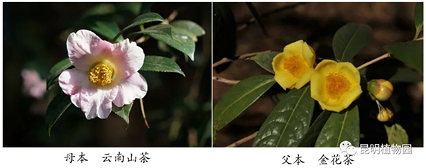 新品种:金滇缘 金滇缘是以云南山茶Camellia reticulata为母本,以金花茶Camellia nitidissima为父本,获得的人工杂交F1代。其花色、花型明显区别于父母本,花瓣数较父母本多,有雄蕊瓣花现象,叶片形状和叶脉显现程度介于父母本之间。经过多年的连续观察,繁殖苗的各项形态性状表现一致,且与母株没有差别,表现出较好的一致性和稳定性。