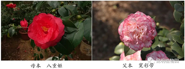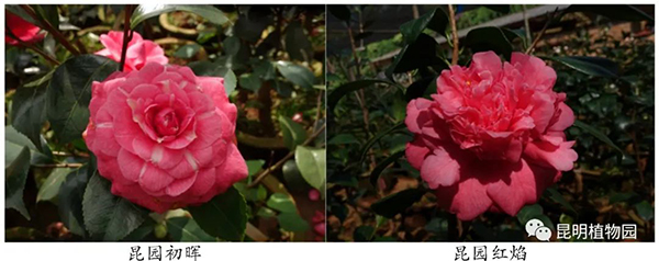 昆园初晖和昆园红焰均是以八重姬Camellia japonica 'Yae-hime'为母本,以宽彩带Camellia japonica 'Margaret Davis'为父本,获得的人工杂交F1代。它们与父母本在花型、花色上区别明显,虽为姐妹品种,但两者差异巨大,昆园初晖为完全重瓣型花,昆园红焰为托桂型花,花色和植株形态也各不一样。经过多年的连续观察,嫁接苗的各项形态性状表现一致,且与母株没有差别,表现出较好的一致性和稳定性。