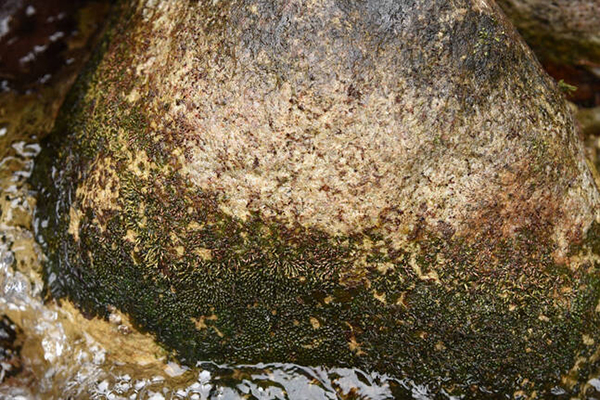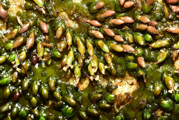 △图2:水苔花的花和果(摄影:陈俊通) 清代袁枚有首咏物小诗叫做“苔”,其中一句“苔花如米小,也学牡丹开”。苔藓植物属于最低等的高等植物不具有真正的花结构,但是如果拿这句诗来描述会开花的种子植物的水苔花倒是更加贴切。它的整个花才约1–2毫米左右,花被片退化成极小的鳞片状,因此在野外如果不是大面积开花,很难发现它在开花。水苔花的根呈叶状体状,绿色,靠吸器紧贴于水中的石头上,形似地衣,因而也称之为水石衣。显然,为了在急流中安家落户,水苔花利用发达的根系紧紧地贴在流水的石头上,并吸收流水中的营养物质。另外,很有意思的现象是水苔花的花常常会随着水位的下降依次开花,但长期暴露于空气中的植株的根茎叶通常会凋亡脱落,但果枝可以借助吸器保存更久。