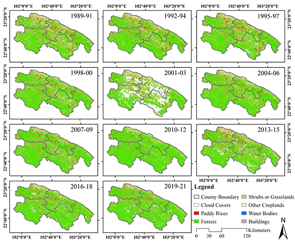 最近,研究发现,哈尼梯田遗产区的水稻种植面积总体呈现减少的态势。 历经1300多年的梯田是以哈尼族为主的各族人民共垦共创的一种世界罕见的农业文化景观,位于哀牢山南部云南省红河州的金平、绿春、元阳与红河四县的哈尼梯田保护区被纳入联合国世界文化遗产。 近日,中国科学院昆明植物研究所许建初研究团队与中国农业科学院农业资源与农业区划研究所周颖研究团队,围绕哈尼梯田保护区开展了梯田水稻种植的时空结构分析。研究团队以三年为时间间隔绘制了过去三十年(1989-91年至2019-21年)哈尼梯田遗产区所在四县的土地利用分布数据。结果得出,哈尼梯田遗产区的水稻种植面积总体呈现减少的态势,从1989-91年的133.79 km2(约占梯田遗产区总面积的13.66%)降至2010-12年的54.52 km2(5.57%),而后增至2013-15年的135.95 km2(13.88%),此后又减少到2019-21年的100.71 km2(10.28%)。