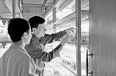 李德铢(右)在实验室工作。种质资源库供图