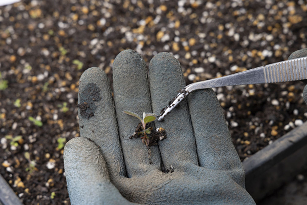 3月27日,许琨在丽江高山植物园一处温室内展示一株准备移栽的杜鹃小苗。 范中玉是丽江高山植物园的工程师。“这些设施被称作种子雨框,用来收集这一片树上落下来的种子。我们还设置三个幼苗框,主要是监测落下来的种子转化成幼苗的比例。”他指着几个方框向记者介绍。