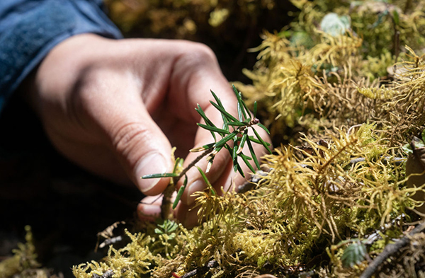 3月28日,在丽江高山植物园云杉坪大样地内一株野生杉树幼苗。 每天早出晚归爬山进行监测,虽然辛苦,但范中玉乐在其中。“看着监测的这些小树逐渐变成大树,大树倒了,枯死了,营养物质进行更新,你就会发现其实人类也遵从同样的规则。”