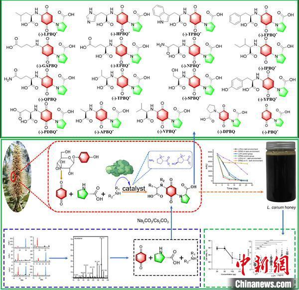 图为研究成果。中国科学院昆明植物研究所 供图 在云南这片神奇的土地,常会看到各种颜色的野生蜂蜜。其中有一种黑蜂蜜,特别显眼。此前,研究人员追根溯源,确定了分布较多的一种黑蜂蜜来源于米团花蜜。 近期,邱明华研究团队从米团花蜂蜜中鉴定出17种2,5-二-(N-(-)-脯氨基)-对苯醌类似物,和一类紫红色的新型色素。这些物质使得米团花蜂蜜表现出显著的颜色蜕变,从紫红色到深棕色。 此外,研究还发现:米团花蜂蜜呈碱性性质;其特有的紫红色氨基酸醌类色素在浓度超过25μM时,毒性显著降低至几乎无细胞毒性。 这一发现证实了米团花蜂蜜作为一种新的食品资源的潜力,为其规模化推广应用提供了有价值的科学依据。相关研究成果于近日发表在期刊Food Chemistry上。(完) (中国新闻网 2024年4月16日) 来源:http://www.chinanews.com.cn/sh/2024/04-16/10199964.shtml |