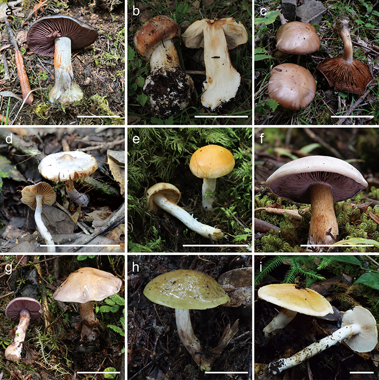 图2 分布于高黎贡山及其周边地区的萨氏丝膜菌属物种。(a)黑盖萨氏丝膜菌;(b)粗柄多形萨氏丝膜菌;(c)铜色萨氏丝膜菌;(d)小白萨氏丝膜菌;(e)黄盖萨氏丝膜菌;(f)薰紫萨氏丝膜菌;(g)淡紫萨氏丝膜菌;(h)污盖萨氏丝膜菌;(i)细柄萨氏丝膜菌。 研究团队对密瑚菌属、丝膜菌属、白丝膜菌属、金耳属、萨氏丝膜菌属和草菇属等代表属进行了深入研究,已经正式发表了21个新种、1个中国新记录种。此外,团队还在该区域发现松茸、云南侧盘菌、东方菌瘿伞、黑肉伞等国家II级保护物种或应该给予重点保护的珍稀濒危物种,以及有开发潜力的新种疣凸金耳。