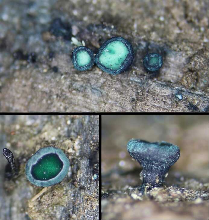 版纳绿杯菌 老君绿杯菌的模式标本发现于云南丽江老君山林中腐木上。它的子实体具有浅蓝色子实层,深蓝色子层托,表面具有宏观模糊不清的绒毛菌丝,中部和基部分叉的侧丝,以及相对较大的梭形子囊孢子。