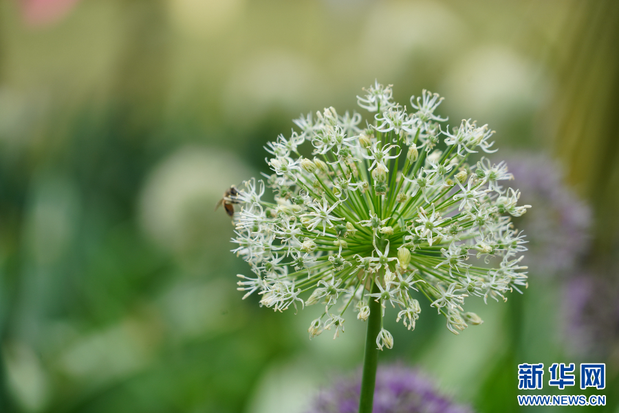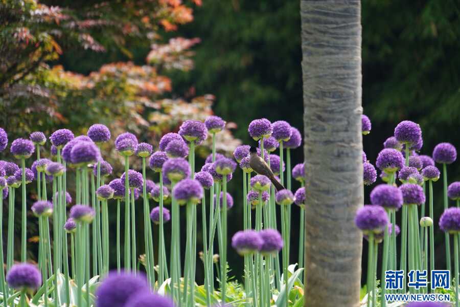 开放着紫色花朵的葱属植物(4月27日摄)。新华网发(曹霞 摄) 细长直立的花茎顶端,层叠次第开放的球形花序如繁星点点,吸引着蜂蝶沉醉期间,这些花序由密集细碎的小花簇拥而成,深深浅浅的紫,组成了浪漫的紫色风景线。