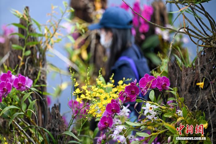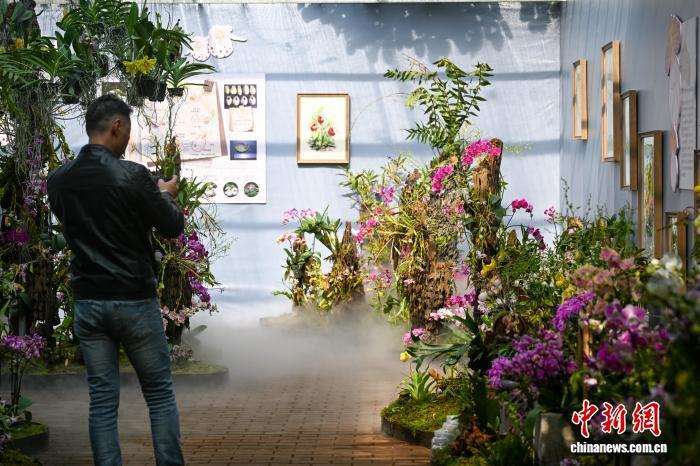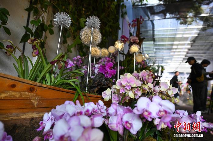 4月15日,云南昆明,观众从用兰花打造的置景旁走过。当日,中国科学院昆明植物研究所昆明植物园第三届兰花展在扶荔宫兰花馆开幕,本届兰花展以“兰芷若芳 一室生春”为主题,展出近400种兰花。中新社记者 李嘉娴 摄
