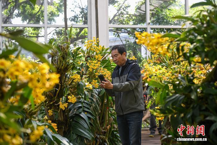 4月15日,云南昆明,属于兰科的鼓槌石斛盛开吸引观众拍摄。当日,中国科学院昆明植物研究所昆明植物园第三届兰花展在扶荔宫兰花馆开幕,本届兰花展以“兰芷若芳 一室生春”为主题,展出近400种兰花。中新社记者 李嘉娴 摄