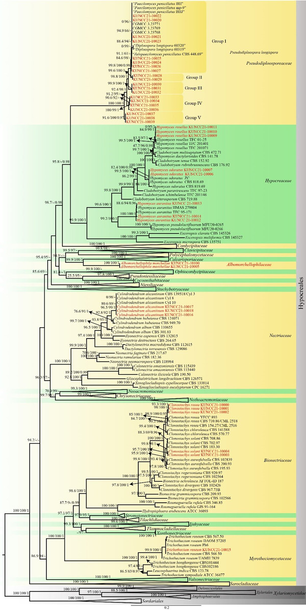 图2 该研究分离的羊肚菌上病原真菌(红色标注)在肉座菌目中的系统发育位置