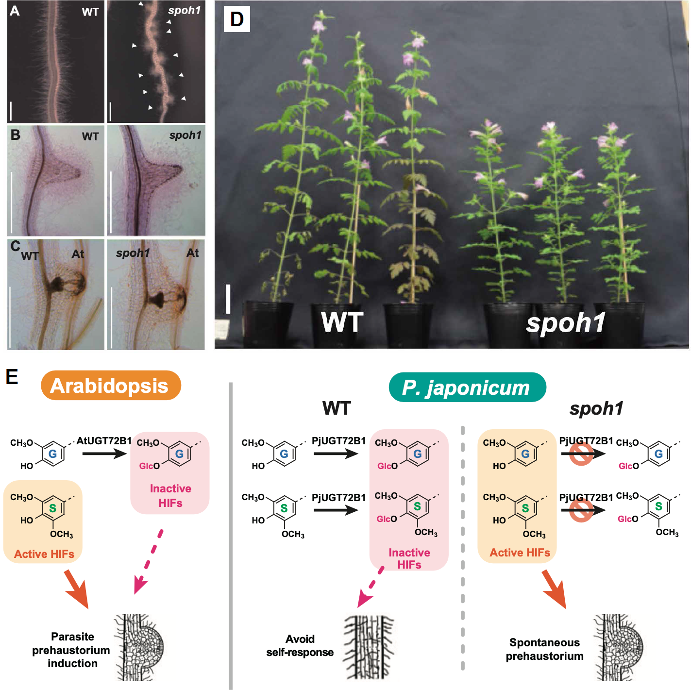 在自然界,植物间存在多种方式的相互作用,包括了互利和寄生。列当科(Orobanchaceae)寄生植物,如松蒿Phtheirospermum japonicum,依赖寄主根部分泌的吸器诱导因子(HIFs),如醌类DMBQ和酚类阿魏酸(Ferulic acid),丁香酸(Syringic acid)触发吸器形成,实现侵染寄主植物窃取养分。然而,这些寄生植物绝大多数情况下只寄生正常的自养植物,而极少“自相残杀”或寄生其它物种寄生植物,这种“亲缘回避”(kin avoidance)现象长期成谜:这些寄生植物如何精准区分“自己”与“异己”? 今日,日本奈良先端科学技术大学院大学(NAIST)与中国科学院昆明植物研究所、日本理化学研究所(RIKEN)等机构的科研人员通过合作,在Science杂志发表题为Glucosylation of endogenous haustorium-inducing factors underpins kin avoidance in parasitic plants(内源吸器诱导因子糖基化使寄生植物实现亲缘回避)的论文,揭示寄生植物通过UDP-葡萄糖基转移酶UGT72B1对自己内源HIFs进行糖基化,从而使自身的HIFs分子失去诱导吸器活性,抑制自主吸器形成并避免寄生同类。 该发现源于松蒿的突变体库筛选。通过科研人员的大量前期工作,获得了spoh1突变体,该突变体植株无需外源HIFs即可在蔗糖介质上自主形成原吸器,形态与DMBQ诱导野生型(WT)松蒿的吸器无异。spoh1根分泌物对WT松蒿及近缘寄生植物独脚金(Striga hermonthica)吸器诱导活性增强,相当于1 µM DMBQ水平,从而证实此突变体的HIFs释放增多。全基因组测序锁定spoh1为PjUGT72B1的提前终止突变,导致此酶功能缺失。PjUGT72B1定位根成熟区,主要通过O-葡萄糖基转移酶(OGT)活性糖基化G/S型HIFs的4-OH位点,生成失活形式(如SyA-Glc)的HIFs,使其丧失诱导活性。体外实验证实PjUGT72B1对S型HIFs更高效,而非寄生植物的拟南芥同源AtUGT72B1仅限对G型HIFs有活性——这种底物特异性差异揭示了列当科寄生植物如何通过“掩盖”自身的HIFs,从而避免“自相残杀”的生理和进化生物学机制。 这项研究不仅阐明了列当科寄生植物进化出的“自保”策略,也为农业抗寄生植物提供了新的靶点:通过编辑作物UGT72B1增强HIFs糖基化,有望使作物对列当科寄生杂草“隐形”,为全球每年挽回超10亿美元损失。 日本奈良先端科学技术大学院大学向蕾为第一作者,Satoko Yoshida为通讯作者,昆明植物所崔松岿为第二作者。