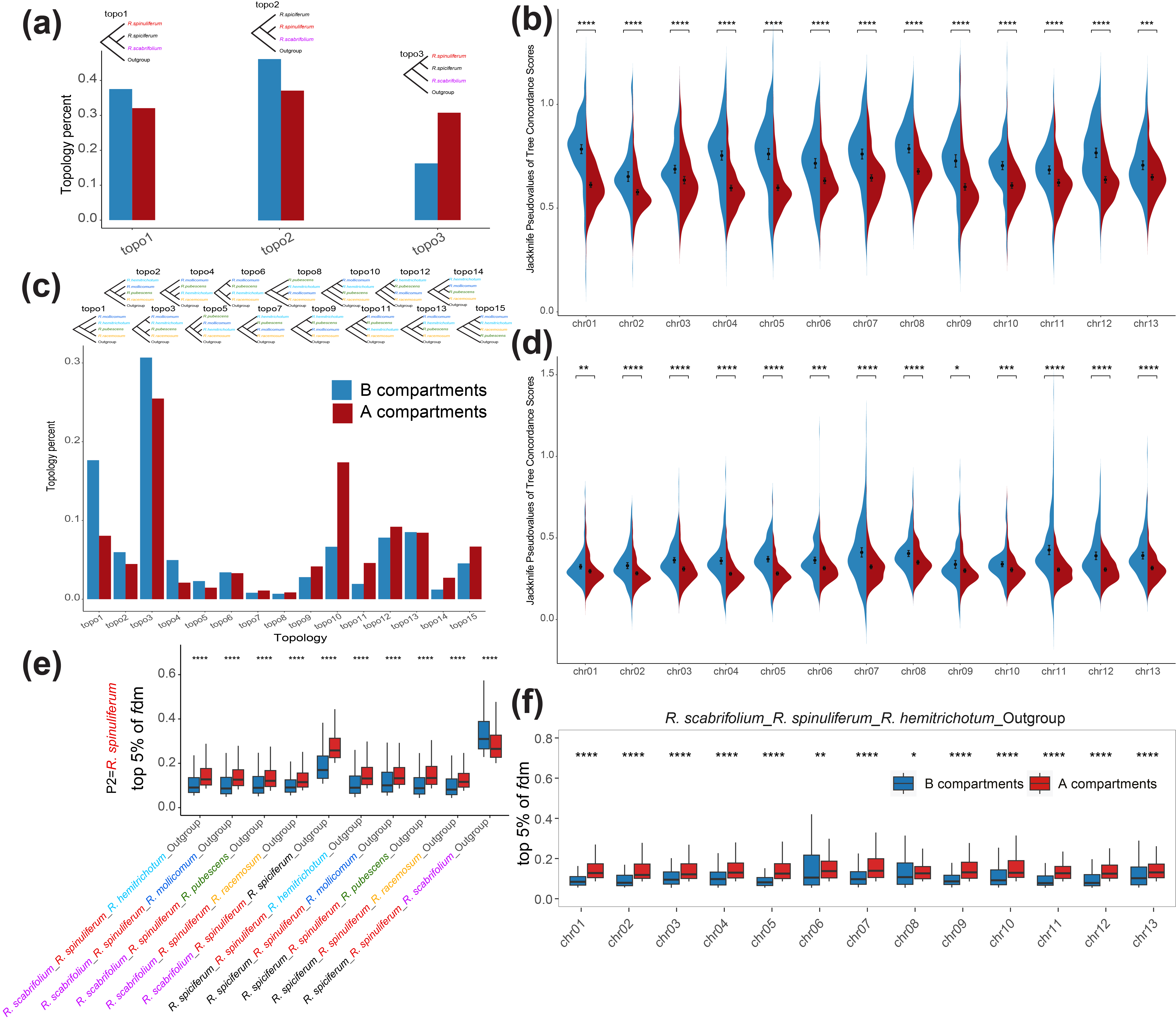 图2 糙叶杜鹃亚组八个物种的分布、群体结构及演化历史 基因组结构是遗传多样性与分化差异的基础 该研究发现,在糙叶杜鹃亚组物种的自然群体中,染色体 A 区室与 B 区室在基因组分化和基因流强度上存在显著差异(图 3)。结果显示包含着丝粒的B 区室在物种间表现出更大的遗传分化(𝐹𝑆𝑇)和分异(𝐷𝑋𝑌 ),相比之下,A 区室则在不同物种中倾向于低的遗传分化水平,具有较低的遗传分化和分异。基于沿基因组10 kb 滑窗的基因流分析表明,在几乎所有的𝑓dm 组合中,A 区室前5% 的𝑓dm 平均值比B 区室前5% 的𝑓dm 平均值高,说明在A 区室中具有更大程度的局部基因渐渗(图 4)。基因组异质性景观的形成可能源于基因组结构对重组率、突变率和选择压力的综合影响:B 区室靠近着丝粒,着丝粒进化迅速且易发生倒位,低重组率加上转座元件积累和杂合不相容性等都会抑制基因流;而 A 区室基因丰富、重组率高,使有益等位基因更易渗入并通过适应性选择快速固定。总体来看,基因组结构不仅塑造了染色体不同区室的遗传多样性与遗传分化模式,也在物种形成和适应性进化中发挥重要作用。