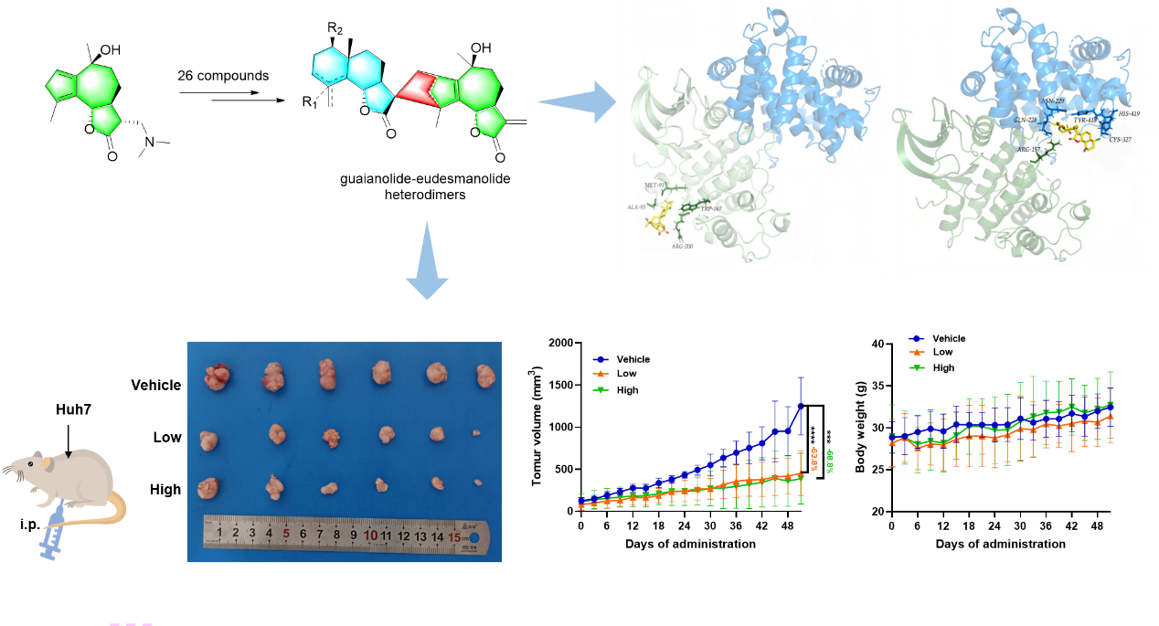 肝癌是全球范围内第六大恶性肿瘤,致死率高,新发病例严重,中国每年新发肝癌患者40余万例,研发新型治疗肝癌药物具有重要意义。中国科学院昆明植物研究所陈纪军研究团队致力于蒿属植物中抗肝癌活性倍半萜二聚体的发现、合成与结构优化、作用机制与靶标及创新药物研究。团队前期从数十种蒿属植物中发现了系列具有显著抗肝癌活性的不同结构类型的倍半萜二聚体,作用于肝癌发生的不同阶段和靶标,具有显著体外、体内抗肝癌作用。然而,二聚体在植物中含量极低,深入研究受限。此外,天然来源的倍半萜二聚体多由相同结构类型的倍半萜聚合而成,不同结构类型倍半萜间聚合形成的杂二聚体则较少。 为丰富倍半萜二聚体的结构类型并发现新型抗肝癌活性化合物,研究团队以不同结构的植物中高含量倍半萜为底物,设计并合成了系列结构新颖的愈创木烷-桉烷倍半萜杂二聚体,构效关系研究发现在骨架中引入卤素、硫、硒等杂原子可提升抗肝癌活性。其中,KGA-4066活性最为显著,通过CMap数据平台和生物信息学分析,并结合CETSA和DARTS、Knock down等实验验证,揭示其作用靶标为周期蛋白依赖性激酶 2 (Cyclin-Dependent Kinase 2,CDK2)。KGA-4066能够有效抑制CDK2/Cyclin A2相互作用,促进CDK2降解,进而诱导细胞周期阻滞和细胞衰老。在小鼠肝癌动物模型中,该化合物具有显著的体内抗肝癌作用,且安全性良好,为开发新型抗肝癌候选药物提供了新的选择。