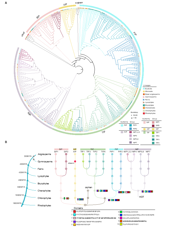 月季无刺新篇章:水通道蛋白PIP2调控皮刺发育的进化密码 ——从基因组学到功能验证,揭示水分适应与皮刺形成的分子纽带 月季以其绝美的花型和芬芳闻名于世,但茎干上密布的皮刺却给田间管理、采收和切花品质寿命带来不利影响。传统观念认为,皮刺是植物抵御草食动物和机械损伤的防御结构。然而,2021年发表于National Science Review的研究(Zhong et al., NSR, 2021;)首次揭示了一个反直觉的现象:月季皮刺在发育早期具有较高的相对含水量,显著高于其它组织,提示皮刺可能兼具“水分储存库”的功能。该研究还在皮刺相关的QTL区间内发现了两个水通道蛋白基因(PIP2s),其表达在无刺品种与有刺品种之间存在显著差异。在此基础上,中国科学院昆明植物研究所胡金勇团队与山东农业大学联合攻关,在Horticulture Research发表最新成果(Zeng et al., HR, 2026;),对植物界水通道蛋白进行了系统进化分析,并以蔷薇科为模型,证实PIP2亚家族受到强烈正选择,且沉默其中关键成员 RcPIP2;1 可显著减少月季茎干皮刺数量。这一发现为培育“无刺月季”提供了全新的分子育种靶点,也为理解植物如何协调水分利用与形态创新打开了新视角。 关键发现之一:水通道蛋白的古老起源与蔷薇科PIP2的正选择 研究团队对涵盖红藻、绿藻、苔藓、蕨类、裸子植物和被子植物等20个代表性物种的524个水通道蛋白进行了系统进化分析。结果显示:水通道蛋白最早出现在红藻中,在轮藻门(Charophytes)已分化出全部五个主要亚家族(PIP、TIP、NIP、SIP、XIP)。PIP亚家族在轮藻门之后进一步分为PIP1和PIP2两个分支,并获得了两个亚家族特有的保守蛋白结构域(结构域3和9),提示功能上的新分化(图1)。在蔷薇科8个物种(包括月季、草莓、苹果、梨、桃等)的325个水通道蛋白中,PIP2和SIP亚家族经历了强烈的正选择,暗示这两类蛋白在蔷薇科适应性进化中获得了新的分子功能。
