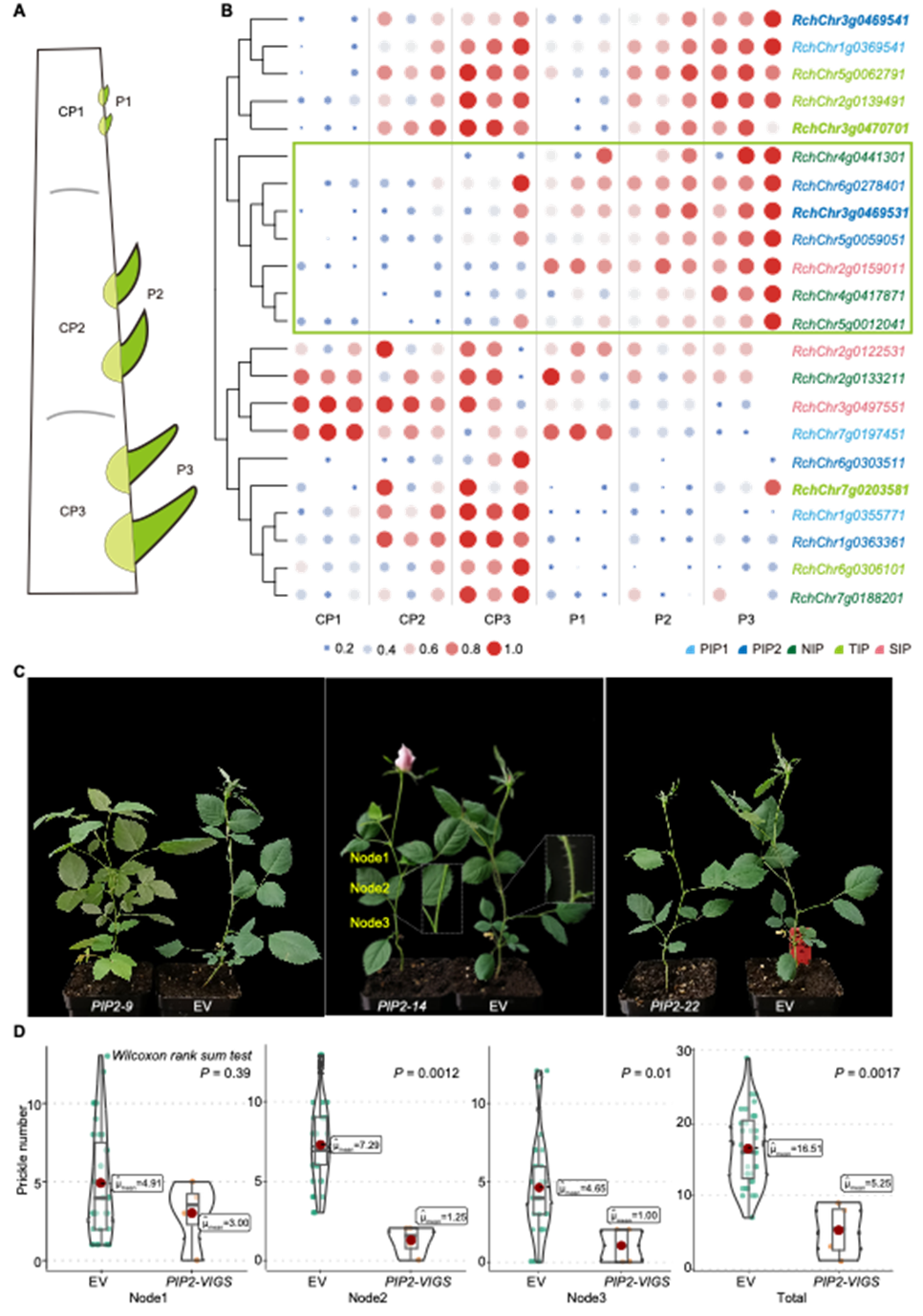 关键发现之二:PIP2;1特异性调控皮刺发育 结合前期QTL定位结果,研究团队发现位于月季第3号染色体QTL1区段的 RcPIP2;1(即 RchChr3g0469531)在皮刺中特异性高表达,且随皮刺成熟表达量上升(图2)。利用病毒诱导的基因沉默(VIGS)技术,在带刺月季品种‘Samantha’中抑制该基因表达后,沉默植株茎干第2和第3节位的皮刺数量显著减少(Wilcoxon检验,P = 0.0012 和 P = 0.01),而空载体对照组无此变化。沉默并未影响植株整体生长和开花,表明 PIP2;1 对皮刺发育具有相对特异的调控作用。一个古老的水通道蛋白家族成员,在蔷薇科中经过正选择后,参与调控皮刺这一测生器官的发育。