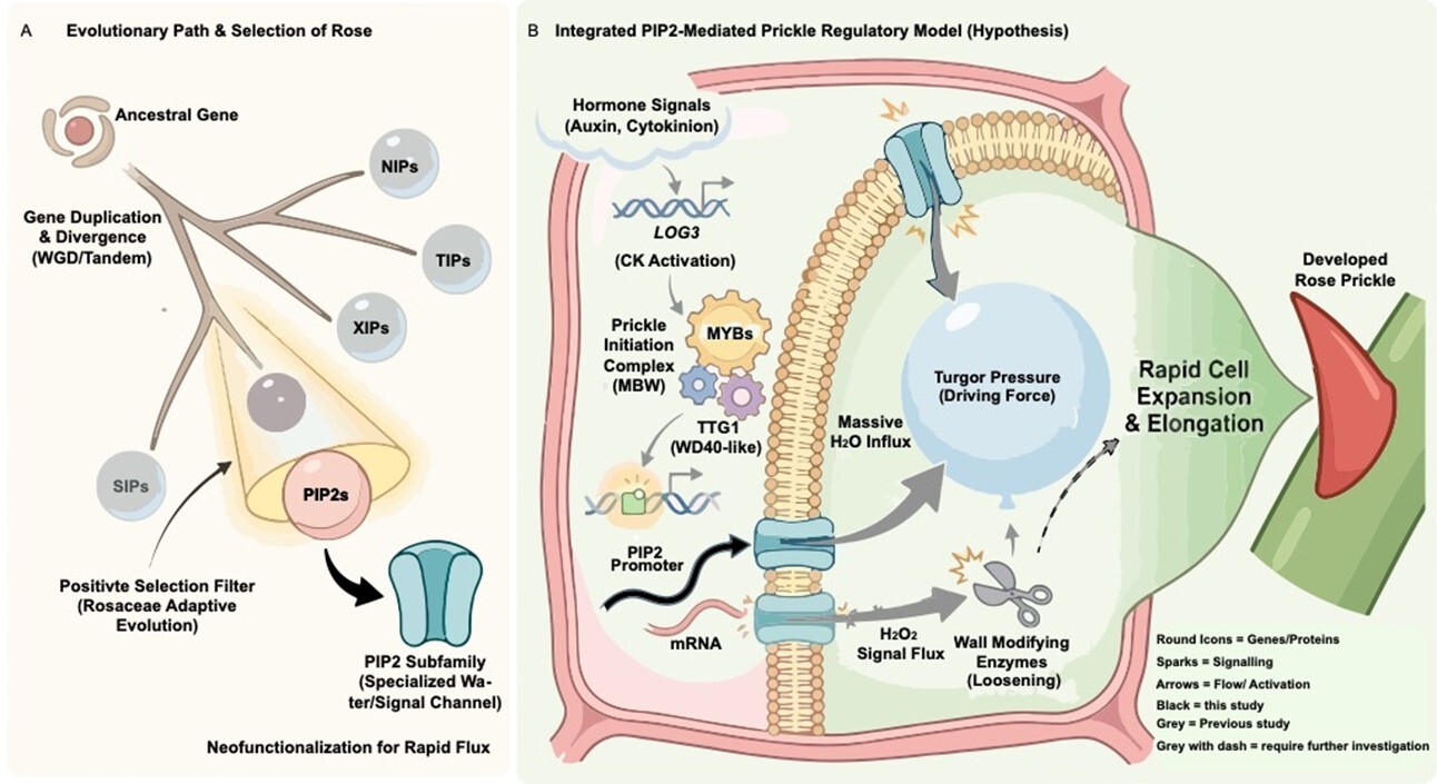 关键发现之三:调控皮刺的进化与分子机制模型与育种应用前景 改写皮刺的功能认知:证明皮刺在早期充当“水分储存库”,揭示了其背后的分子开关PIP2水通道蛋白。皮刺不仅是被动的防御结构,更是主动的水分调控器官,其发育与植物的水分适应策略紧密耦联。进化生物学启示:水通道蛋白家族的古老起源与PIP2在蔷薇科中的正选择,展示了“保守蛋白家族通过调控序列的趋异演化,被反复重用为形态创新驱动者”的范式。这为理解植物如何利用有限的基因工具箱创造多样的表皮附属物(如毛状体、皮刺、腺体)提供了新线索。PIP2;1 的VIGS沉默能显著降低皮刺密度而不影响生长,提示针对该基因及其启动子区调控元件的基因编辑(如CRISPR-Cas9)有望培育出“少刺”或“无刺”的月季新品种,也许还可推广至其他带刺经济作物(如蔷薇科果树、花椒、茄子等)。