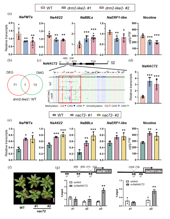 昆明植物所在DNA甲基化通过NaNAC72调控烟草生物碱的生物合成研究中取得进展 DNA甲基化是一种保守的表观修饰,它可以调控很多基因的表达。已有研究表明,DNA甲基化参与次生代谢的生物合成调控,但是证据大多来自DNA甲基化抑制剂的处理。目前研究中缺乏DNA甲基化调控次生代谢物的遗传证据和具体的调控机制。 尼古丁是烟草属植物中含量最丰富的生物碱,在抵御植食性昆虫方面发挥着关键作用。目前在栽培烟草(Nicotiana tabacum)的相关研究中已鉴定出多个正调控尼古丁合成的转录因子,如NtMYC2、NtERF189、NtERF199和NtMYB305a。与之相反,关于尼古丁合成负调控因子的报道则较少。因此,发现新的负调控因子不仅对于理解植物如何抵御植食性昆虫至关重要,对于通过突变培育尼古丁含量可控的烟草品种也具有重要价值。 中国科学院昆明植物研究所植物次生代谢分子调控专题研究组此前的研究表明,二倍体野生烟草(N. attenuata)中多数根特异性表达的尼古丁相关基因共享“DNA甲基化谷”特征(Tong et al., 2025)。但目前尚缺乏DNA甲基化调控尼古丁的系统研究。 因此,该研究首先探究了DNA甲基转移酶的作用,发现沉默不同DNA甲基转移酶基因对尼古丁合成相关基因表达影响不同,其中NaDRM2-like2沉默后关键酶基因NaPMTs及调控基因NaERF1-like表达显著降低。进而通过CRISPR/Cas9构建的NaDRM2-like2突变体表现出尼古丁合成相关基因(NaPMTs、NaA622和NaERF1-like等)表达下调、叶片中尼古丁含量减少及对广食性害虫斜纹夜蛾(Spodoptera littoralis)更敏感的表型。 为揭示突变体尼古丁减少的原因,该研究通过全基因组重亚硫酸氢盐测序(WGBS)和RNA测序,在14个差异甲基化的转录因子与72个差异表达的转录因子中筛选到一个共有基因——NaNAC72。在突变体中其启动子甲基化升高,同时表达量升高3倍以上。共表达分析显示,NaNAC72与根特异性表达的尼古丁相关基因呈强负相关。 进一步功能验证显示,CRISPR/Cas9敲除NaNAC72可使叶片中尼古丁含量增加35%~42%,而过表达NaNAC72则抑制尼古丁合成相关基因表达并降低叶片尼古丁含量。凝胶阻滞实验与染色质免疫沉淀实验证实NaNAC72可直接结合尼古丁关键合成酶基因NaPMT1.1及关键调控基因NaERF1-like的启动子,抑制其转录活性。 综上,该研究得出结论:DNA甲基转移酶基因的沉默会影响尼古丁相关基因表达;NaNAC72是尼古丁生物合成的新负调控因子。该发现为解析防御代谢物的表观遗传调控机制及培育尼古丁含量可控的烟草品种提供了新视角与靶点。 相关研究成果以Transcriptional Activation of NaNAC72 Suppresses Nicotine Biosynthesis in DNA Methyltransferase NaDRM2-like2 Mutants of Nicotiana attenuata为题,在Plant Biotechnology Journal在线发表。中国科学院昆明植物研究所博士研究生佟阿慧为论文第一作者,吴劲松研究员和王蕾研究员为论文共同通讯作者,云南烟草农业科学院王丙武副研究员,已毕业硕士研究生李荣平和云南民族大学客座硕士研究生茶学局参与此项研究。研究得到了云南基础研究重大计划(编号202401BC070015)等项目支持。