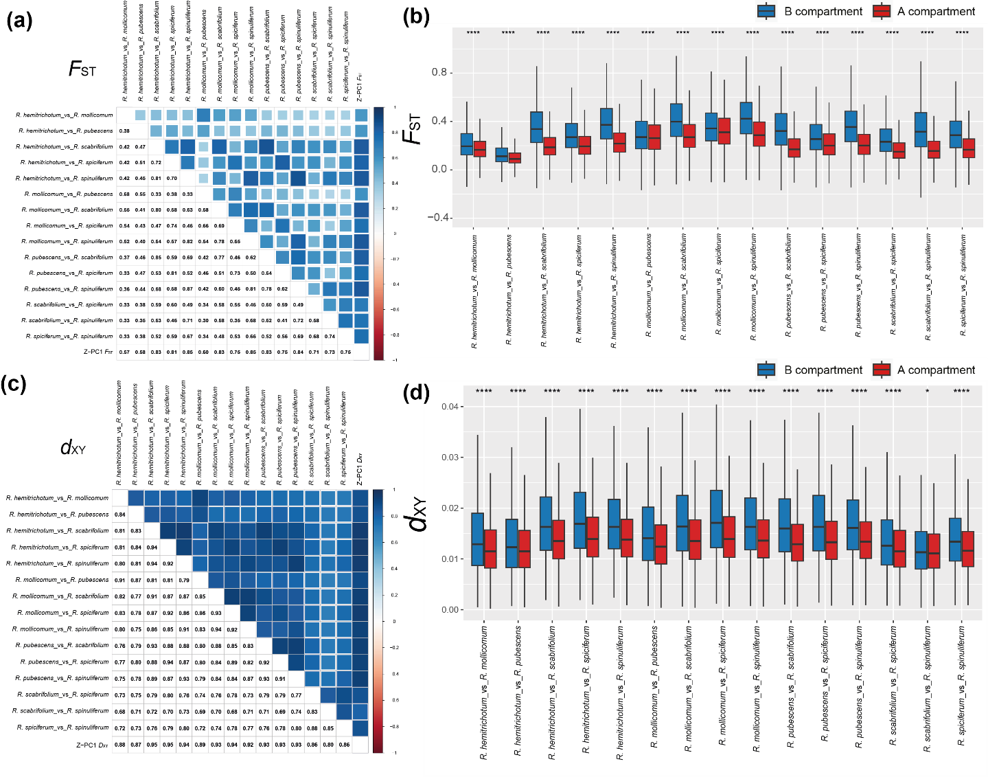 图2 糙叶杜鹃亚组八个物种的分布、群体结构及演化历史 基因组结构是遗传多样性与分化差异的基础 该研究发现,在糙叶杜鹃亚组物种的自然群体中,染色体 A 区室与 B 区室在基因组分化和基因流强度上存在显著差异(图 3)。结果显示包含着丝粒的B 区室在物种间表现出更大的遗传分化(𝐹𝑆𝑇)和分异(𝐷𝑋𝑌 ),相比之下,A 区室则在不同物种中倾向于低的遗传分化水平,具有较低的遗传分化和分异。基于沿基因组10 kb 滑窗的基因流分析表明,在几乎所有的𝑓dm 组合中,A 区室前5% 的𝑓dm 平均值比B 区室前5% 的𝑓dm 平均值高,说明在A 区室中具有更大程度的局部基因渐渗(图 4)。基因组异质性景观的形成可能源于基因组结构对重组率、突变率和选择压力的综合影响:B 区室靠近着丝粒,着丝粒进化迅速且易发生倒位,低重组率加上转座元件积累和杂合不相容性等都会抑制基因流;而 A 区室基因丰富、重组率高,使有益等位基因更易渗入并通过适应性选择快速固定。总体来看,基因组结构不仅塑造了染色体不同区室的遗传多样性与遗传分化模式,也在物种形成和适应性进化中发挥重要作用。