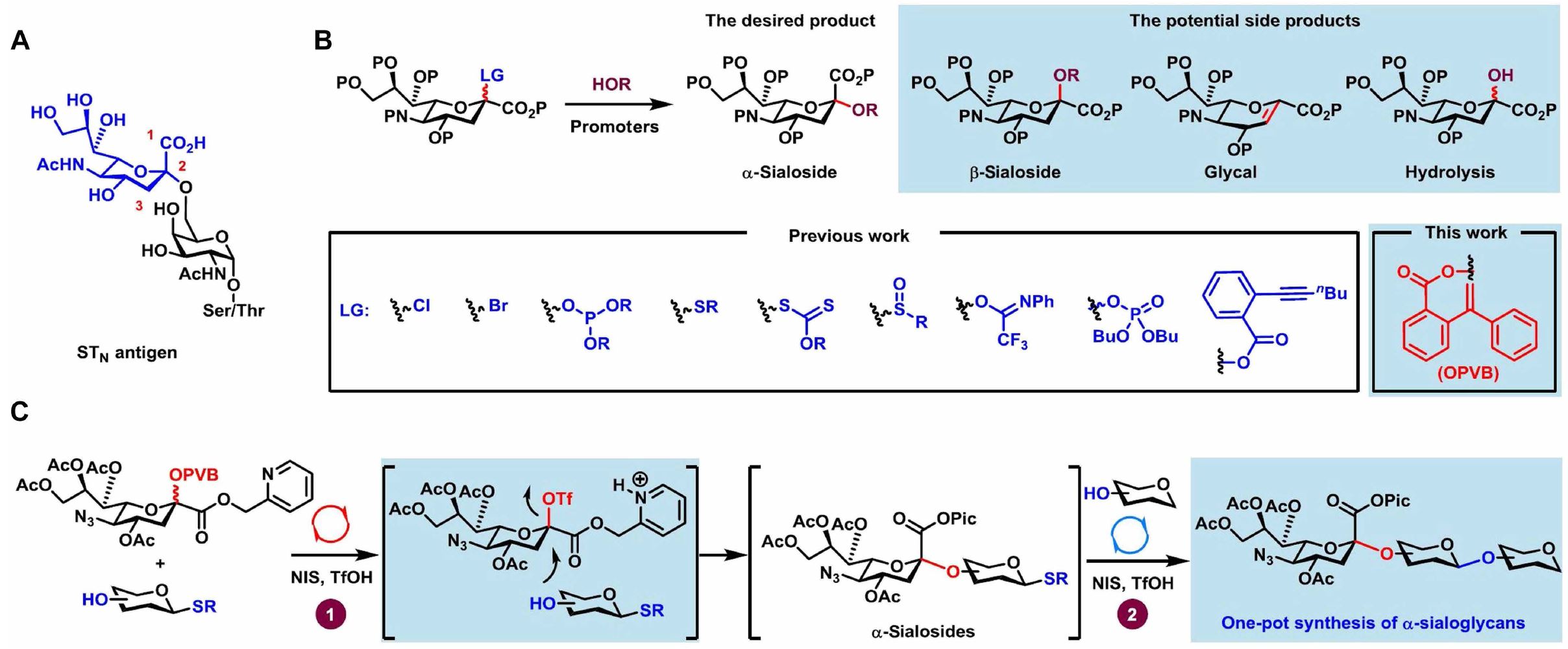 唾液酸是哺乳动物中最重要的单糖之一,主要被发现于糖蛋白和糖脂的末端,并以α-糖苷键构型存在。唾液酸聚糖是非常重要和结构多样的生物分子,在许多生理过程中扮演着重要的角色,如免疫反应、病原体-宿主识别、大脑发育和肿瘤发生等。然而,从自然界中分离提取高纯度、结构确定和足量的唾液酸聚糖非常困难。高效合成唾液酸聚糖也是一个长期存在的难题。由于唾液酸独特的化学结构,如何实现高立体选择性构建α-唾液酸糖苷键仍然是一个大的挑战。 最近,中国科学院昆明植物研究所植物化学与天然药物全国重点实验室肖国志专题组报道了采用邻1-苯基乙烯基苯甲酸脂(PVB)为唾液酸离去基团,实现了α-唾液酸糖苷键的高效构建。同时,利用唾液酸PVB给体的高反应活性,实现了基于反应活性的一锅法合成各种不同的唾液酸聚糖,包括神经节苷脂Hp-s1和STN抗原。而且,通过与山东大学陆刚教授合作进行密度泛函理论计算,揭示了唾液酸PVB给体比相应的唾液酸硫苷给体具有更高反应活性的原因。 该工作以Highly efficient α-sialylation with ortho-(1-phenylvinyl)benzoates as leaving groups: One-pot assembly of α-sialoglycans为题,发表在Science Advances。该工作的第一作者为张云琴博士和嵇玉洁博士生,通讯作者为肖国志研究员和陆刚教授。该工作得到了国家自然科学基金和云南省科技厅等的大力资助。