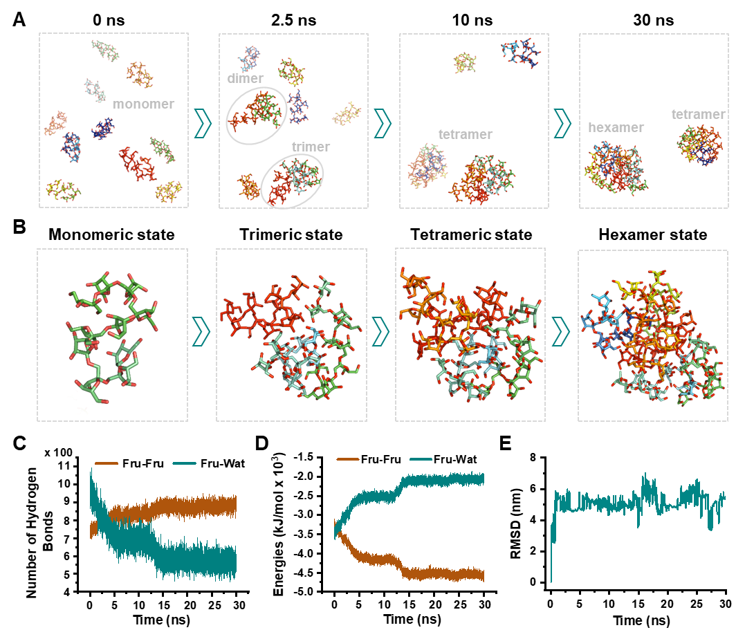 图1 分子动力学模拟臭参多糖的超分子自组装行为 长期以来,中国科学院昆明植物研究所植物化学与天然药物全国重点实验室吴明一研究员团队,面向人民生命健康和地方经济社会发展的重大需求,致力于云南特色食药植物和高等真菌等生物资源在生命大健康领域的创新利用。该团队持续开展天然多糖的纯化制备、结构解析、药理活性以及成药性评价等相关基础研究,形成了云南特色资源天然多糖功效物质基础研究的创新技术体系,以促进天然糖类新药物的发现与创制。 近期,该团队对云南特色的一种臭参(学名为管钟党参,Codonopsis bulleyana)开展了功效活性成分的发掘研究。结果发现,多糖是其主要的物质成分(粗多糖含量高达16%)。研究人员从中纯化并解析了三种不同分子量的多糖,证实它们均为同源的、由β-(2→1)糖苷键连接的线性菊粉型果聚糖。令人意外的是,这些多糖在水溶液中均能自发组装成稳定的超分子纳米球或圆盘结构。分子动力学模拟证实,这一组装过程是由分子间氢键热力学驱动的自发行为。