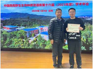董扬教授报告现场 学术年会第二阶段,各专题组推荐的青年学者与研究生共做11个精彩学术报告。经过专家对学术报告内容进行评议,评选出朱安丹专题组博士研究生金鑫的报告“八倍体草莓的起源”荣获一等奖;徐伟专题组青年学者韩冰的报告“蓖麻胚乳基因组印记的表观调控机制研究”荣获二等奖;周伟专题组博士研究生曾志华的报告“表型和基因组自交综合征的演化关系--以报春花属植物为例”荣获三等奖。 李德铢研究员为一等奖获得者金鑫颁奖 学术年会第三阶段由部门年度工作总结、支撑系统年度工作总结、专题攻关组年度进展交流、党总支工作总结、库办公室工作总结、年度安全管理颁奖活动等部分组成,各单元对2023年的工作进行了总结报告和交流,普诺 白玛丹增所长听取了报告并进行了点评发言。 李德铢研究员做总结发言,通过学术年会的交流,肯定了种质库过去一年中在成果产出、人才队伍建设、研究能力等方面的提升;2024年,应围绕充分发挥体系化建制化优势、抢占科技制高点,在科学问题凝练上,各研究领域应该努力切入国际学科前沿;在个人能力建设和团队能力建设方面都应做到更长远的规划和更高的站位,促进种质库的发展。