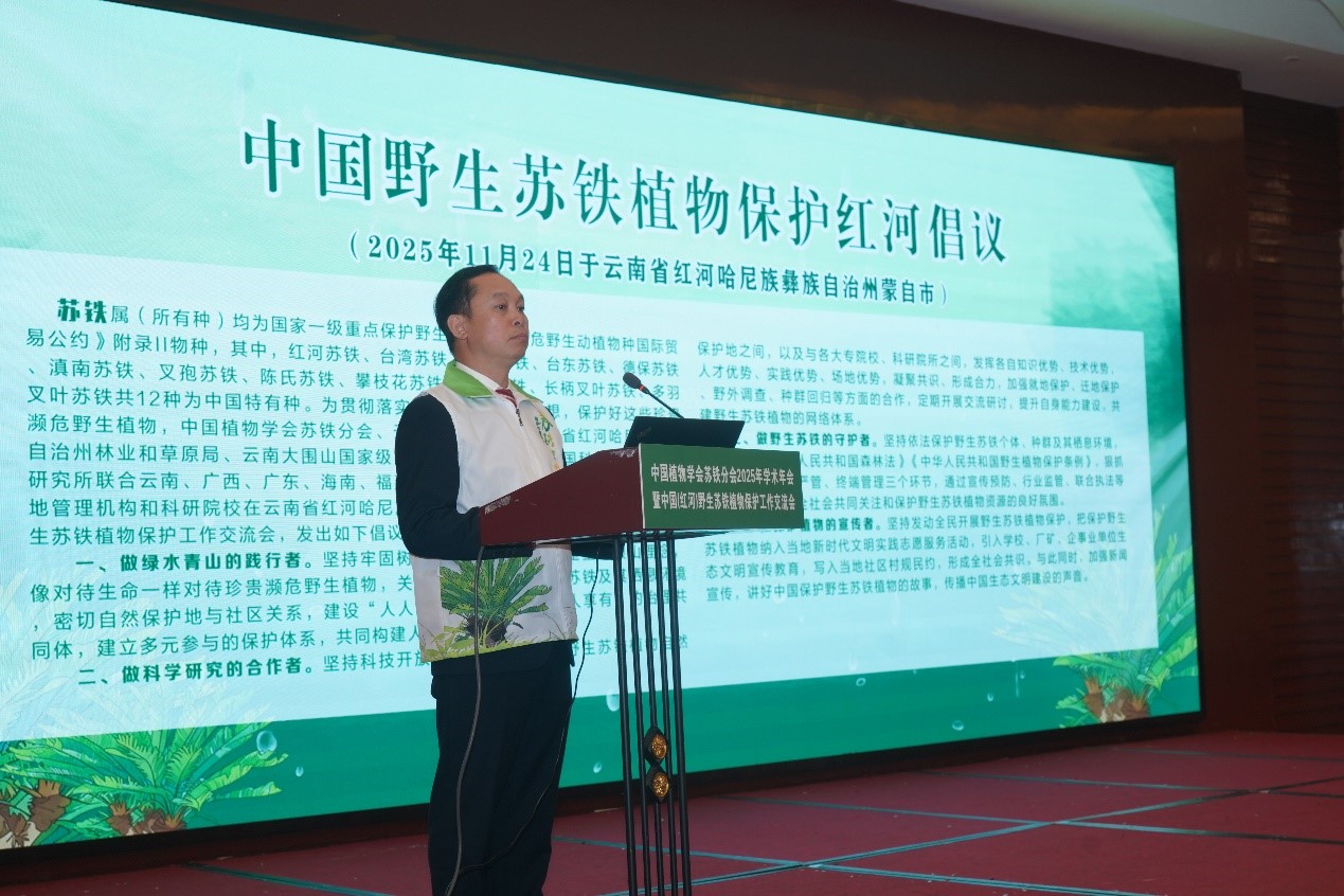 云南大围山国家级自然保护区管护局局长白玉文宣读倡议 会议的成功举办,不仅为国内苏铁植物领域的专家学者构建了一个高效、专业的学术交流与合作平台,也为推动我国苏铁植物保护事业的系统化、科学化发展奠定了坚实基础。未来,与会各方将以此次会议为契机,进一步凝聚共识、加强协作,共同推进苏铁植物的研究与保护工作迈向新台阶。