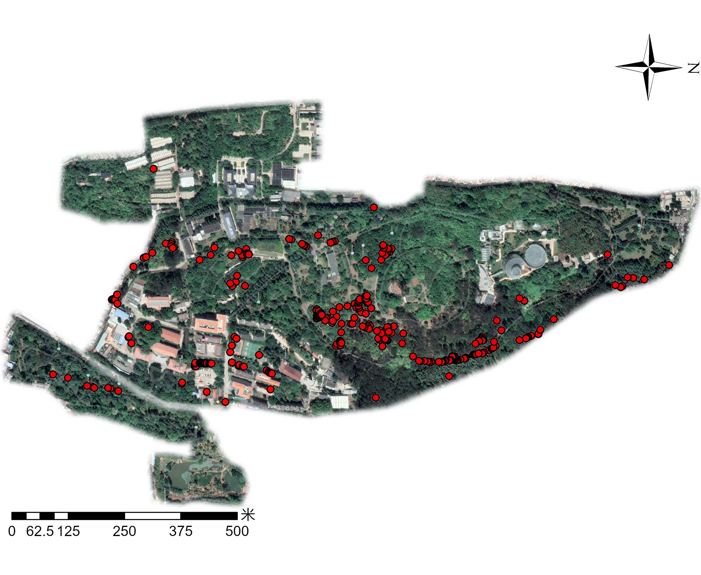 2025年11月23日2026年1月4日,工作人员对处在花期的高盆樱桃植株开展了每株编号、定位、影像采集、数据上传等活植物信息登记工作,经过数据交叉检查、对比确认,最终完成了195株植物的鉴定和查证,完善了该物种在昆明植物园活植物信息管理系统(简称PIMS系统)中的鉴定查证信息。其中,所园区与科研保育区分布有61株,专类园区有134株,如蔷薇园、裸子植物园、观叶观果园、醉鱼草木樨园和羽西杜鹃园等均有小片种植出现。图2是195株高盆樱桃在园区的空间分布。