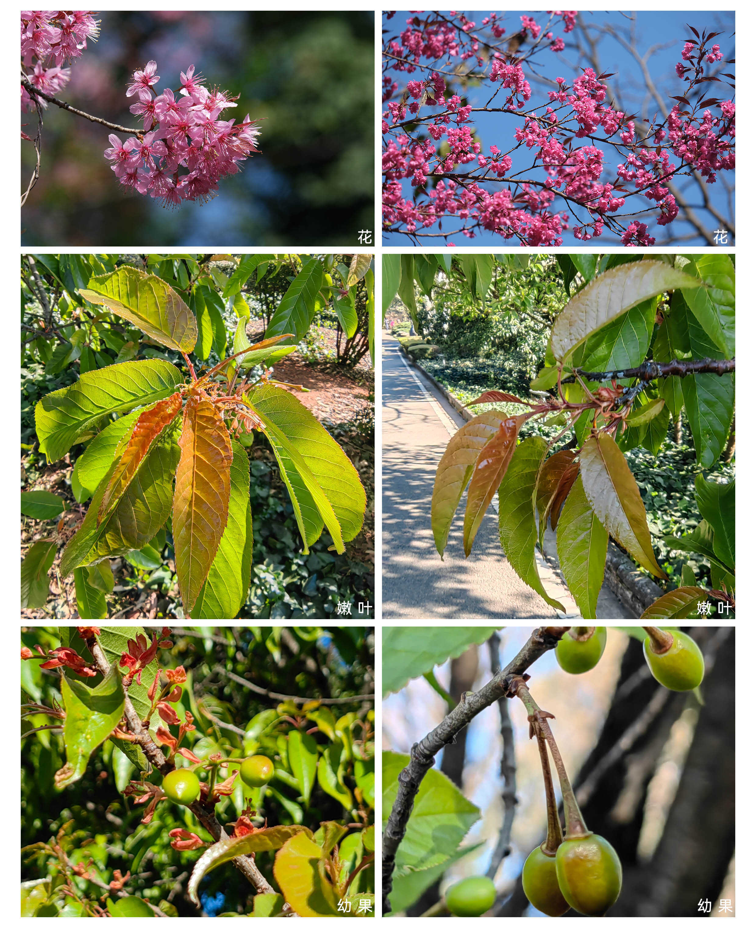 图3 高盆樱桃(Prunus cerasoides)花、叶、果的季相影像